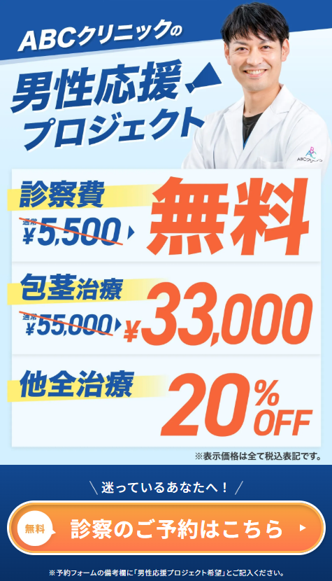 また、ABCクリニックでは全ての施術が20%OFFになる「男性応援プロジェクト」を実施中ですので、無料カウンセリングの予約を行う際は忘れず適用させましょう。