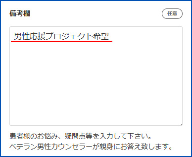 必ず「男性応援プロジェクト希望」と明記して送信してください。クリニックからの折返し連絡を待ちましょう。