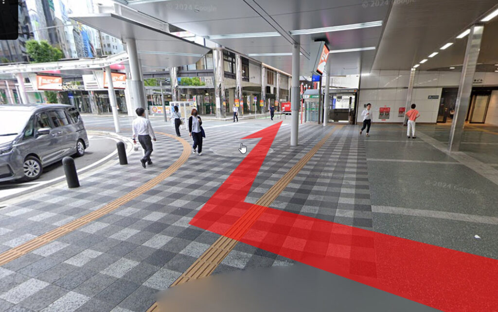 ①JR博多駅 筑紫口を出たら、すぐ右の道に入ります。