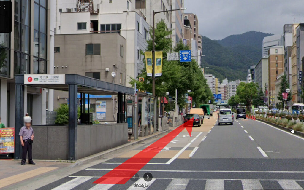 地下鉄三宮駅 東出口1を出たら、しばらく直進します。