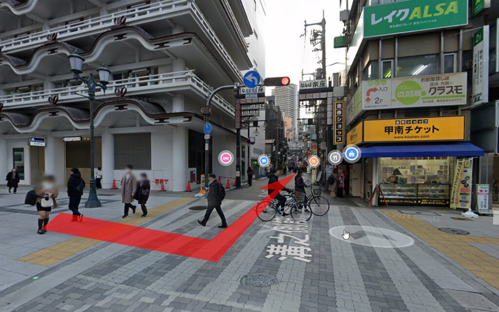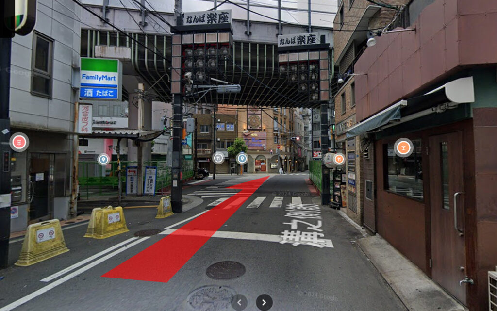 JR難波駅12番出口を左に出て、甲南チケット横の道を直進します。