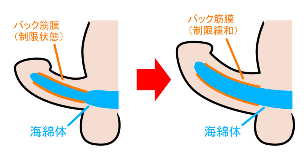 このバック筋膜を処置することで締め付けが緩和され、血流がスムーズになり海綿体が広がりやすくなります。その結果、平常時・勃起時の両方でサイズアップ効果が期待できる、というのが大きな特徴です。