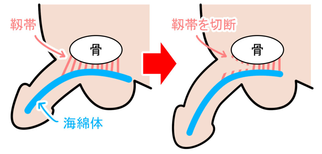 陰茎を支えている靭帯の一部を切り離し、体の内側に隠れていた根元部分を前に出すことで長さを改善する手術です。