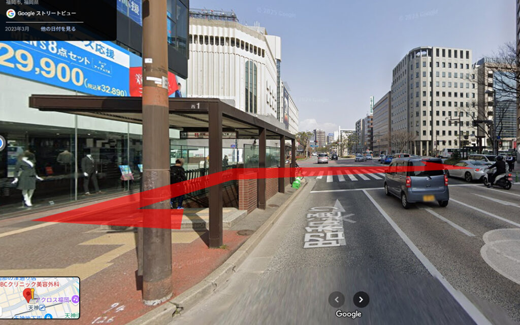 ①地下鉄天神駅 西1番出口を出たら、すぐ後ろの横断歩道を渡ります。