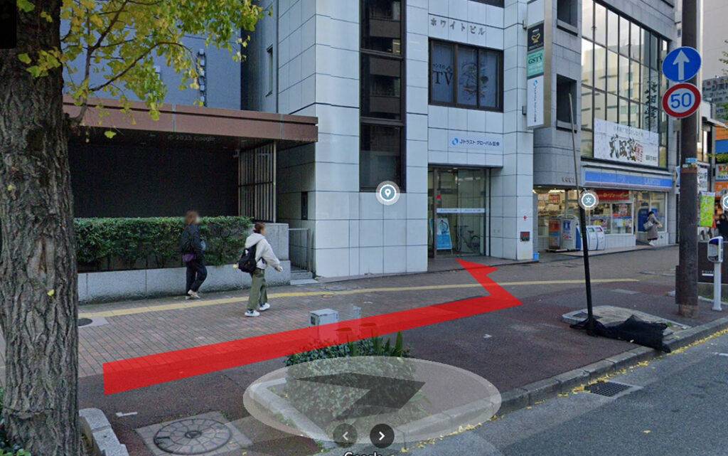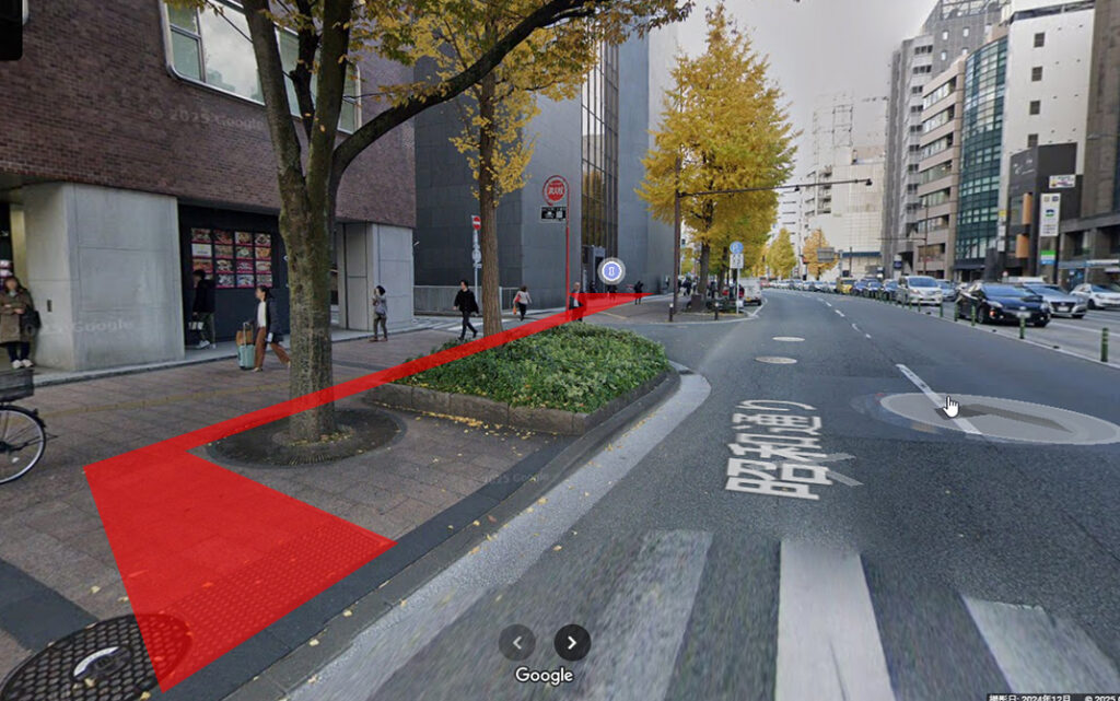 ②横断歩道を渡り終えたら、歩道を右に進みます。