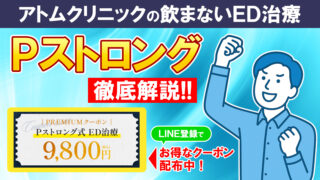 Pストロング 薬を使わないED治療「Pストロング」|税込9,800円にて実施中 この記事では、税込9,800円で受けられるアトムクリニックの「Pストロング」の利用方法などを詳しく解説していきます。自然な勃起力の回復をサポートする新しい治療を格安で受けることができるチャンスなので、ぜひ最後までご覧ください。Pストロング初... 2025.11.12 Pストロング
