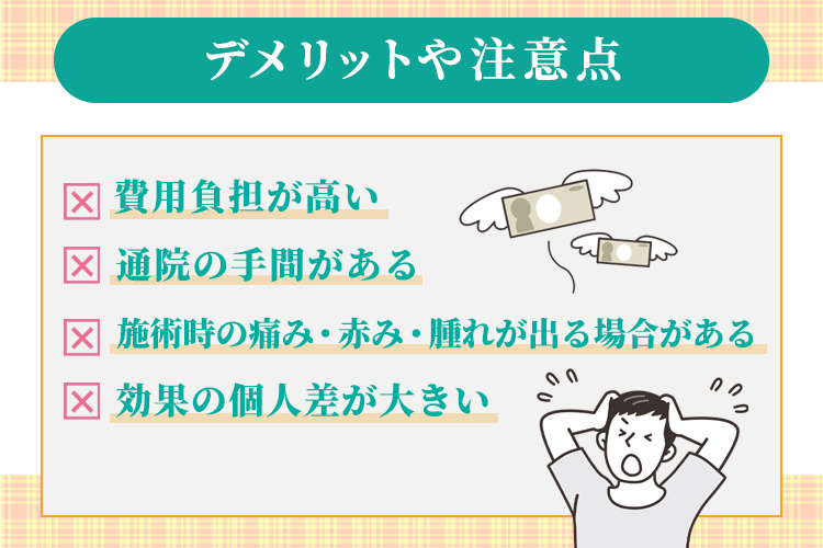 身体的負担 施術時の痛みや、施術後の赤み・腫れなどの一時的な副作用があります。また、まれに内出血が生じることもあります。