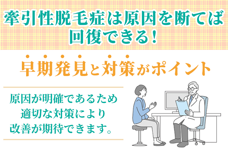 初期段階であれば原因となる髪型をやめることで改善可能ですが、長期間放置すると毛包が障害を受け永久的に髪が生えなくなるリスクもあるため、早期発見と適切な対策が重要です。